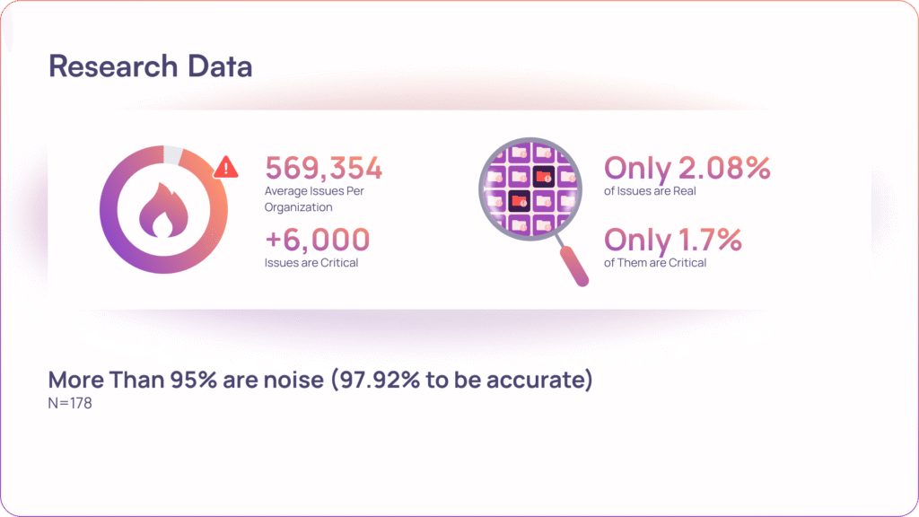 Our research, spanning over 101 million security findings across 178 organizations, shines a spotlight on a fundamental inefficiency in modern AppSec operations. Of nearly 570,000 average alerts per organization, just 202 represented true, critical issues.