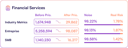 The data tells a powerful story: By using evidence-based prioritization, the alarming average of 569,354 total alerts per organization can be reduced to 11,836, of which only 202require immediate action.